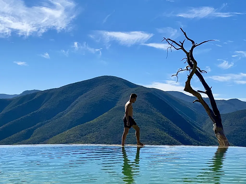 Despite its name, which translates to “boiling water,” the pools are actually cool and refreshing—perfect for a dip on a hot Oaxaca day. The setting is spectacular: two petrified waterfalls, bubbling freshwater springs, and mineral-rich pools perched on a cliffside with jaw-dropping views of rolling valleys.