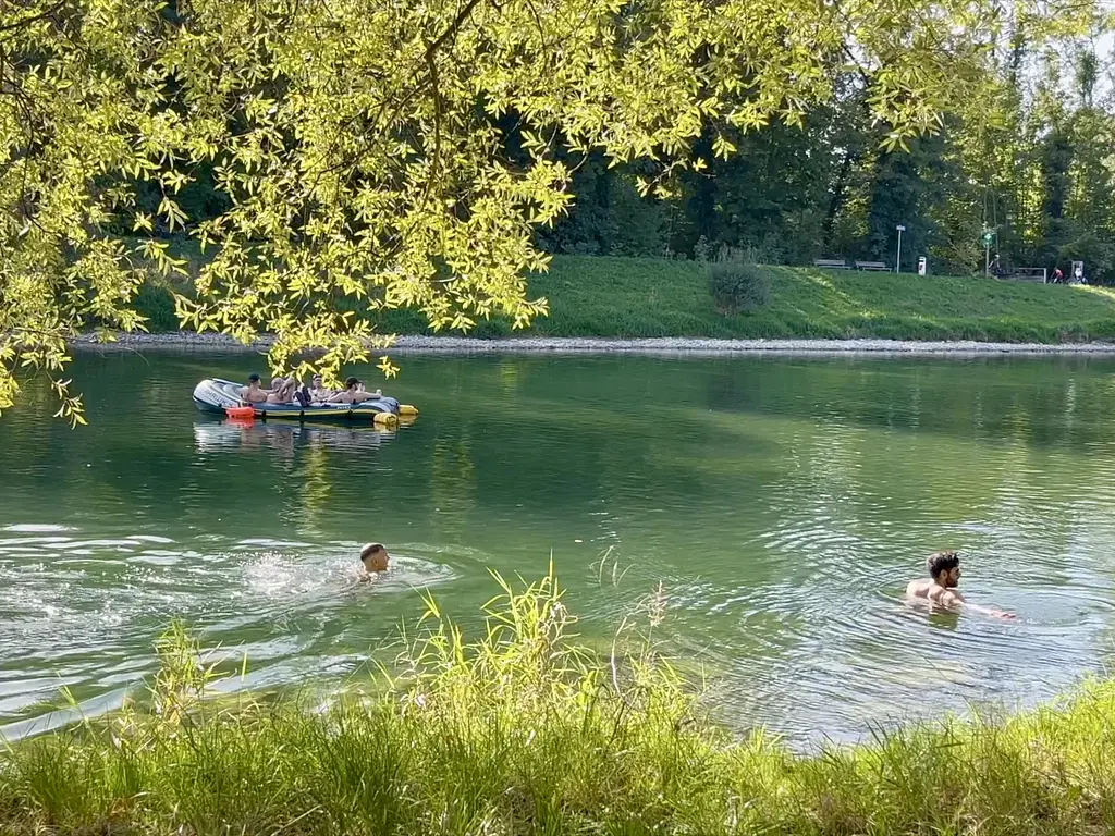 - Guys swimming, floating, and chatting in the Limmat